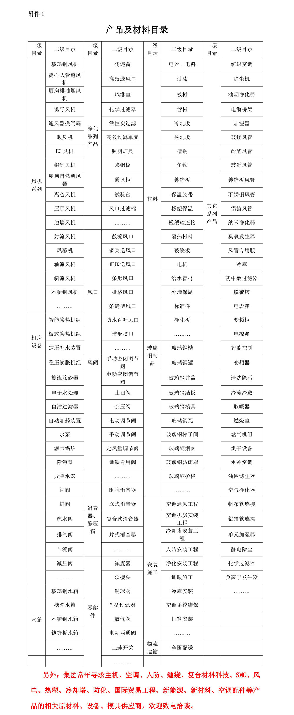 附件一:产品及材料目录
