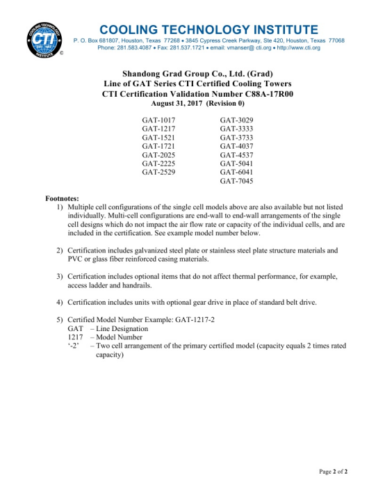 格瑞德冷却塔公司拥有国家级冷却塔性能检测基地,并且入围中核集团合格供应商。玻璃钢横流冷却塔(GAT系列)产品均通过了国家级权威检测机构的检测,其中冷却塔的热力性能、漂水率、耗电比、噪音等关键技术指标处于国际先进水平,取得了美国CTI认证、中国节水产品认证、中国节能产品认证、中国冷协CCTI认证。