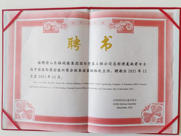 中国国际商会是经中国国务院批准,于1988年成立的全国性商会组织,业务指导单位是中国贸促会,现有会员7.8万家。中国国际商会德州商会作为中国企业投资柬埔寨的服务者,在格瑞德集团成立柬埔寨办事处,旨在更好地连接中柬资源,让中柬合作走深走实,积极服务德州企业“请进来”、“走出去”,进一步开拓柬埔寨市场,扩大贸易合作。