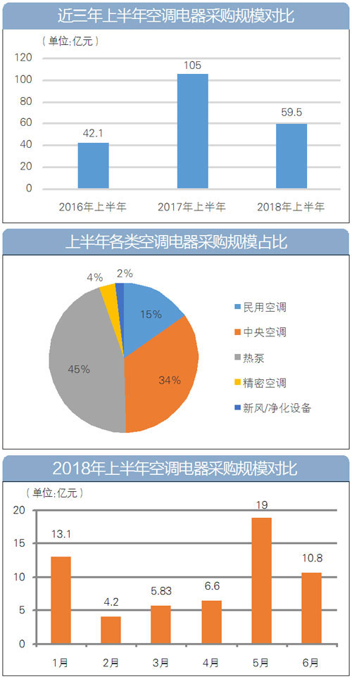 通常情况下,政府采购规模呈现出一年一个台阶的增长态势,但也有例外。据《政府采购信息报》记者不完全统计,上半年,全国共完成空调电器采购项目逾2000个,采购总规模约59.5亿元,与2017年同期相比,采购额出现大幅下滑趋势,降幅为43%。“之所以下滑,可能是因为在北京平原地区煤改电市场趋于饱和的情况下,其他北方地区煤改电招标投标项目仍未取得突破性进展。”业内专家认为。此外,除了煤改电项目外,在轨道交通、医疗和教育千万元以上大项目的推动下,空调采购市场呈现一派繁荣景象。