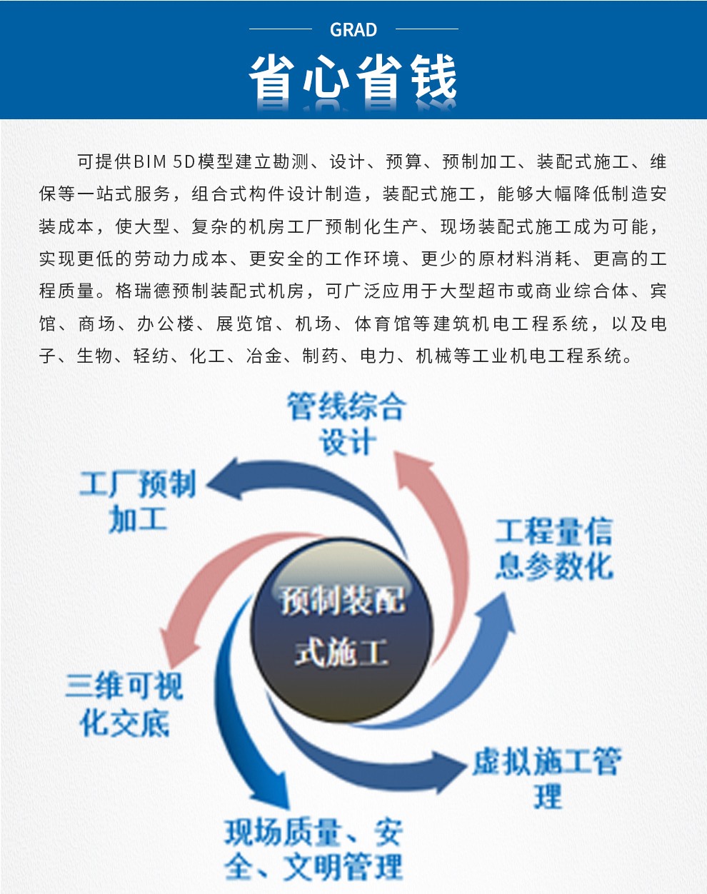 格瑞德致力于让人工环境更美好,通过打造空调工程、通风人防、复合材料、环保工程领域的全过程解决方案来满足客户需求,格瑞德构建了包括品牌规划、系统设计、技术开发、产品制造、整体施工、维护服务、检测认证、人才交流、产业集群的全生命周期产业链和产业生态。